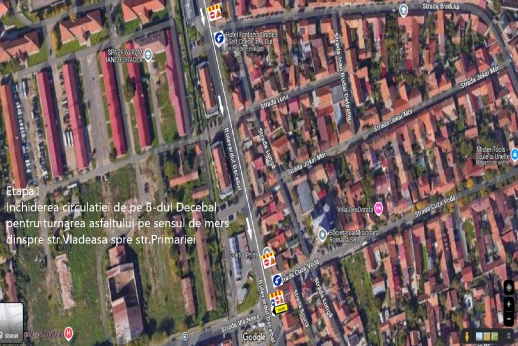 - Etapa I: Traficul pe direcția de mers Parcul Bălcescu – Biserica Emanuel va fi deviat pe strada Vlădeasa.