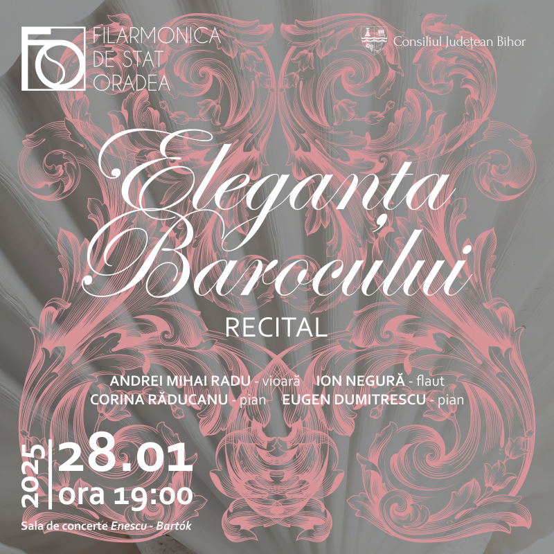 Marți, de la ora 19:00, Filarmonica Oradea găzduiește recitalul „Eleganța barocului”, în care artiști de renume vor interpreta lucrări clasice și contemporane dedicate acestui stil muzical. Evenimentul îi va aduce pe scenă pe Andrei Mihai Radu (vioară), Ion Negură (flaut), și pe pianiștii Corina Răducanu și Eugen Dumitrescu.